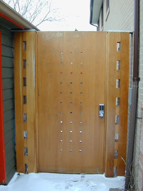Construction - 4- 4"x 4" pressure treated post laminated with solid African mahogany. Gate is 2 sheets of 3/4" mahogany marine ply laminated with computer router cut design. Stainless steel post caps.